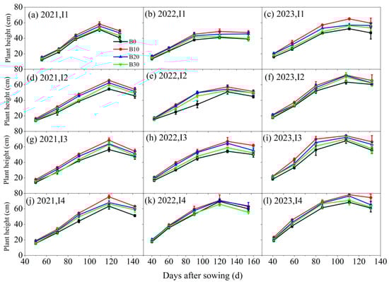 The changes in sugar beet plant height under varying irrigation levels and biochar application rates are presented in Figure 3. Throughout the three-year experiment, sugar beet plant height initially increased with the number of sowing days, peaking before eventually declining. The highest plant height was consistently observed under the I4B10 treatment. Biochar application significantly contributed to increased plant height under consistent irrigation conditions. In 2021, the plant heights for the B10, B20, and B30 treatments increased by 20.6%, 13.8%, and 6.9%, respectively, compared to the B0 treatment. Similarly, under the same biochar application rates, plant height increased with higher irrigation levels. In 2021, plant heights under the I2, I3, and I4 irrigation treatments increased by 13.1%, 17.3%, and 26.7%, respectively, compared to the I1 treatment. This trend was consistently observed in 2022 and 2023, demonstrating the beneficial effects of both biochar application and increased irrigation on sugar beet plant height.