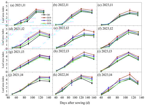 Leaf area index of sugar beet under different irrigation amounts and biochar application rates in 2021, 2022, and 2023.
