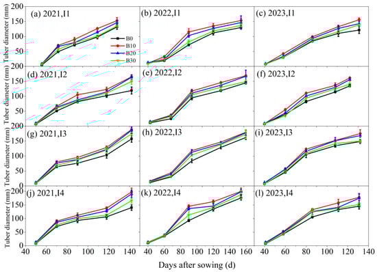 Tuber diameter under different irrigation amounts and biochar application rates in 2021, 2022, and 2023.