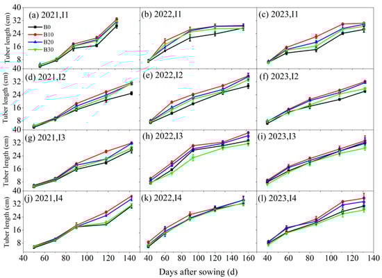 Under varying irrigation levels and biochar application rates, the tuber diameter and tuber length of sugar beet reached their maximum under the I4B10 treatment, both increasing with the number of sowing days (Figure 5 and Figure 6). Biochar application led to a 5.6%, 19.2%, and 6.3% increase in tuber diameter under the I2, I3, and I4 irrigation treatments, respectively, compared to the I1 treatment. Similarly, with the same irrigation amount, the B10, B20, and B30 biochar treatments resulted in a 31.2%, 22.4%, and 12.3% increase in tuber diameter, respectively, compared to the B0 treatment. Additionally, under the same irrigation amount, root length followed the trend B10 > B20 > B30 > B0. Conversely, with the same biochar application rate, tuber length increased with irrigation amounts in the order I4 > I3 > I2 > I1.