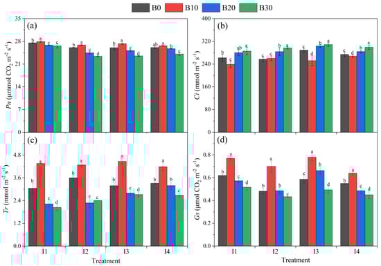(a–d) Net photosynthetic rate (Pn), stomatal conductance (Gs), intercellular carbon dioxide (Ci), and transpiration rate (Tr) of sugar beet under different irrigation amounts and biochar application rates. Error bars represent standard errors. Different letters above the bars indicate statistical differences among treatments at the significance level p < 0.05 with an LSD test.