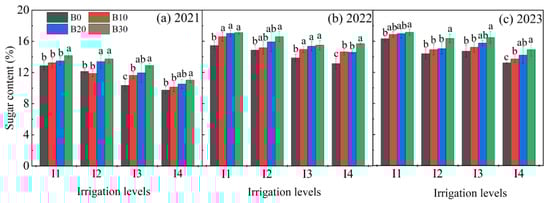 Sugar content under different irrigation amounts and biochar application rates in 2021, 2022, and 2023. Error bars represent standard errors. Different letters above the bars indicate statistical differences among treatments at the significance level p < 0.05 with an LSD test.
