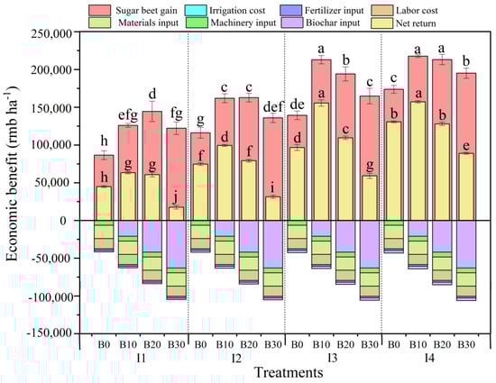 Economic benefit of sugar beet cotton under different irrigation amounts and biochar application rates in 2021, 2022, and 2023. Error bars represent standard errors. Different letters above the bars indicate statistical differences among treatments at the significance level p < 0.05 with an LSD test.