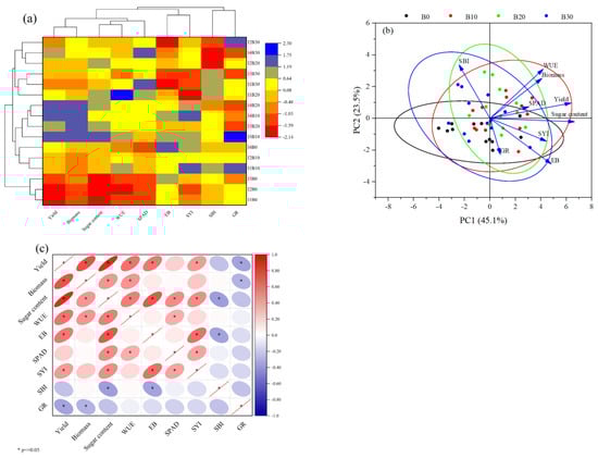 Figure 10 shows the relationships among various indices, such as beet emergence rate, yield, WUE, EB, and SYI, under different combinations of irrigation and biochar treatments. The data indicate that the I3B10 treatment consistently resulted in higher levels of yield, biomass, and sugar content. Treatments I3B10, I3B20, I4B10, and I4B20 clustered together, with I3B10 exhibiting superior WUE, EB, and SYI. Conversely, treatments I1B0, I2B0, and I3B0 formed a distinct group, underscoring the catalytic effects of biochar on sugar beet growth (Figure 10a). Principal component analysis (PCA) revealed that yield, biomass, WUE, SPAD, sugar content, and SYI were closely interrelated. Although GR can enhance sugar beet yield, its effect was not significant (Figure 10b). A comprehensive analysis of various indices identified the B10 biochar application as the most favorable treatment (Figure 10c).