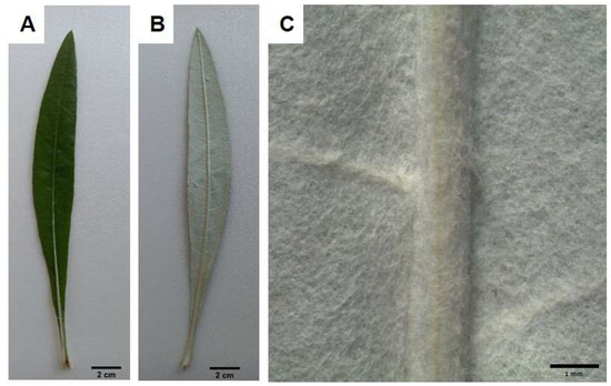 Leaves had a large strongly lanceolate blade, dark green in color on the upper side (Figure 1A) and greyish on the lower one (Figure 1B). At high magnification, a dense tomentum entirely covering the abaxial surface of the leaf was detected (Figure 1C).