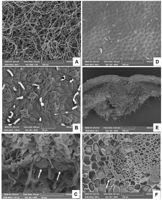 SEM micrographs of a leaf of P. greuteri: (A) non-glandular trichomes on the lower surface; (B) lower surface of the leaf from which non-glandular trichomes have been removed; stomata and striated cuticle are clearly visible; (C) enlargement of abaxial epidermis highlighting raised stomata (arrows); (D) upper glabrous surface of the leaf showing polygonal-shaped epidermal cells; (E) a transversal section of the leaf in which it can be observed the organization of vascular bundles inside the midrib and the dense tomentum on the lower epidermis; (F) magnification of a vascular bundle with a secretory duct near the phloem (arrow).