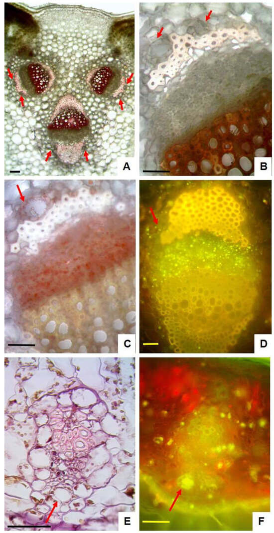 Leaf transversal sections of P. greuteri: (A,B) handmade sections stained with phloroglucinol and HCl: (A) detail of the midrib with three vascular bundles, secretory ducts (arrows) near the caps of supportive sclerenchyma stained pink with phloroglucinol and HCl; (B) magnification of a single vascular bundle in which two secretory ducts were clearly visible above the sclerenchyma overlying the phloem (arrows); (C,D) magnification of a vascular bundle in the midrib: stained with Sudan III (C) and Fluorol Yellow (D) highlighted the presence of small lipid droplets inside the secretory cells surrounding the ducts (arrow) and within the parenchyma cells of the phloem; (E,F) detail of the collateral vascular bundles in the mesophyll blade: (E) a semithin section stained with Hematoxylin–Eosin revealing the presence of one small secretory duct near the phloem (arrow); (F) a handmade section in which lipophilic substances inside the duct positively reacted with Fluorol Yellow (arrow). Bars: (A) = 100 µm; (B–F) = 50 µm.