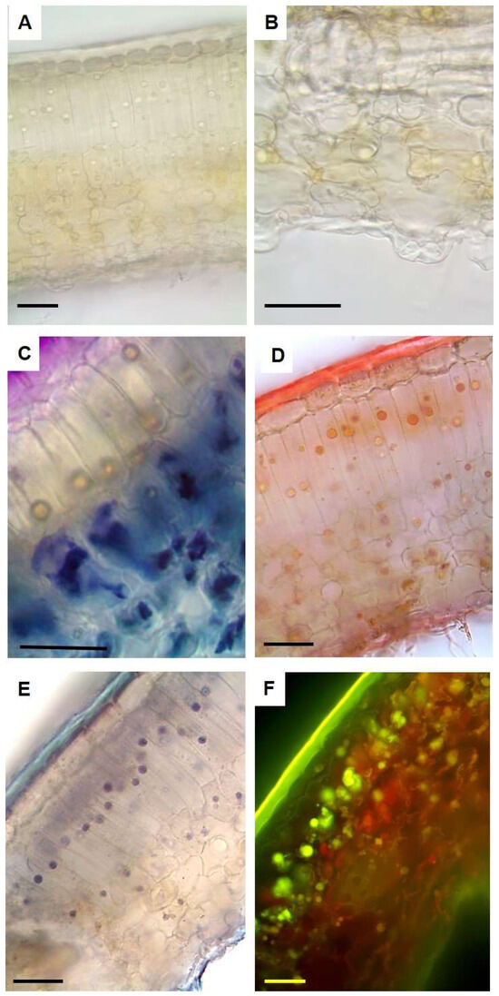 The clarification with an aqueous solution of chloral hydrate highlighted a bilayer mesophyll where the cells of the upper layer were more elongated than those of the innermost one (Figure 4A). On the adaxial side, a tick cuticle was visible in the cleared sections (Figure 4A) and it positively reacted with all lipid-specific dyes test (Figure 4D–F). The abaxial epidermis showed raised stomata (Figure 4B), as previously observed by SEM analysis (Figure 2C). The presence of a single spherical droplet per cell were observed in the palisade and more rarely in some cells of the spongy parenchyma (Figure 4A). In the bleached sections stained with TBO, no reaction of the droplets was observed, while the presence of polyphenols was shown by the blue-green staining (Figure 4C). On the contrary, the droplets reacted positively with lipid-specific dyes, appearing red/orange with Sudan III (Figure 4D), dark blue with Sudan Black (Figure 4E) and bright yellow with Fluorol Yellow (Figure 4F), highlighting their lipophilic nature.