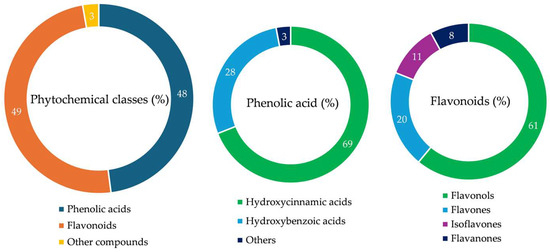Phytochemicals identified in the leaf hydroalcoholic extract of P. greuteri. The results are expressed as a percentage of the main classes with respect to the total of the identified compounds. For phenolic acids and flavonoids, the subclasses to which they belong, with the relative percentages, were also identified.