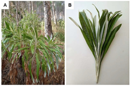 (A) P. greuteri growing at its collected site (Mt Inici); (B) detail of the leaves at the apex of a branch.