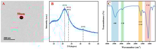 Characterizations of biochar nanoparticles. (Note, (A) TEM image; (B) XPS whole pattern; and (C) FTIR, respectively).