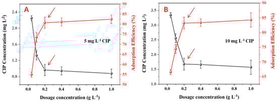 Determination of optimal dosage for biochar nanoparticles (BNPs) in ciprofloxacin (CIP) solutions. (Note, (A) adsorption efficiency and CIP concentration at 5 mg L−1 CIP; (B) adsorption efficiency and CIP concentration at 10 mg L−1 CIP. The arrows indicate the optimal BNP dosage of 0.2 g L−1 for both CIP concentrations).