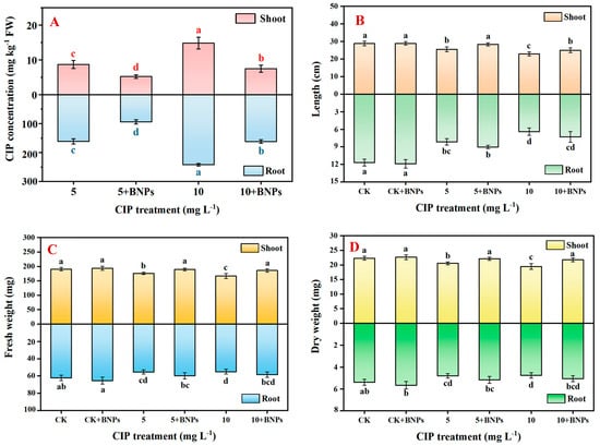 Effects of ciprofloxacin (CIP) and BNP exposure on rice seedlings. (Note, (A) CIP accumulation after 9 days of CIP and BNP exposure; (B) length of shoots and roots after 9 days of CIP and BNP exposure; (C) fresh weight of shoots and roots after 9 days of CIP and BNP exposure; and (D) dry weight of shoots and roots after 9 days of CIP and BNP exposure. BNPs, biochar nanoparticles. Data points and error bars represent means ± S.D., respectively; different letters indicate significant differences (p < 0.05)).