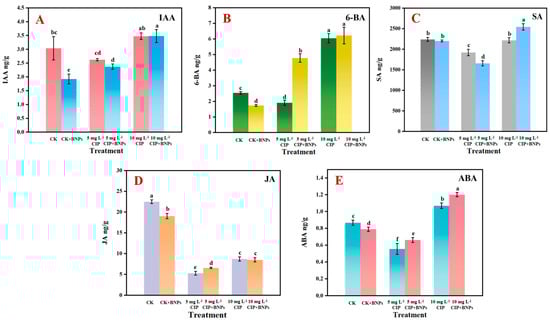 Effects of ciprofloxacin (CIP) and biochar nanoparticles (BNPs) on hormone concentrations in rice plants measured on day 9. (Note, (A) indole-3-acetic acid (IAA), (B) 6-benzylaminopurine (6-BA), (C) salicylic acid (SA), (D) jasmonic acid (JA), and (E) abscisic acid (ABA). Data points and error bars represent means ± S.D., respectively. Different letters indicate significant differences (p < 0.05) between treatments).