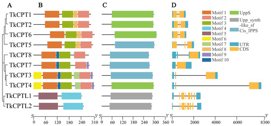 Evolutionary analyses showed that TkCPT3 was more closely related evolutionarily to TkCPT4, and TkCPT1 was more closely related to TkCPT2 (Figure 1A). Conserved motif analysis of TkCPT proteins showed that motif 1, motif 2, and motif 3 were present in all TkCPTs (Figure 1B), and in particular, all family members except TkCPT6 contained motif 4. The two members of TkCPTL, on the other hand, had fewer motifs present, only motif 4 and motif 5, but were quite conserved. Analysis of the structural features of TKCPT/CPTL revealed that all proteins contain UPPS structural domains or belong to the UPPS superfamily (Figure 1C). TkCPT family members have different positions and lengths of untranslated regions (UTRs) and coding sequences (CDSs), with the number of CDSs ranging from one to three, and TkCPTL members have more CDSs, totaling six. Except for TkCPT4, members of the same evolutionary branch had similar UTR and CDS features (Figure 1D).