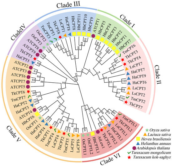 Evolutionary analysis of TkCPT/CPTLs proteins in T. kok-saghyz, T. momgolicum, A. thaliana, H. annuus, H. brasiliensis, L. sativa and O. sativa. Evolutionary trees were plotted using the Maximum likelihood (ML) method using the optimal model of T92+G with 1000 bootstrap replicates. Sixty-four proteins were divided into six clades (I–Ⅵ) and identified using different colors. TkCPT/CPTLs proteins from different species were labeled with different shape types. The red pentagram represents T. kok-saghyz, the green hook represents T. momgolicum, the purple circles represent A. thaliana, the blue triangle represents H. annuus, the yellow square represents H. brasiliensis, the orange triangle represents L. sativa and the green pentagram represents O. sativa.