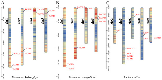 Chromosomal location of TkCPT/CPTL genes in the T. kok-saghyz genome (A), T. mongolicum genome (B) and L. sativa genome (C). The scale on the left is in megabases (Mb), indicating that the gene chromosome density of the TkCPT/CPTL gene is indicated in blue to red from low to high, respectively. Chromosome numbers are placed on the left and marked in black. The TkCPT/CPTL gene numbers are shown on the right side of each chromosome and are marked in red.