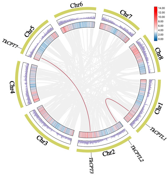 Collinearity analysis of TkCPT/CPTL gene. The gray lines in the background represent collinear modules in the T. kok-saghyz genome. The red lines indicate TkCPT/CPTL gene pairs with collinearity. The outer yellow rectangle represents the chromosome, the middle rectangle with the purple line represents gene density, and the inner circle represents another form of gene density.