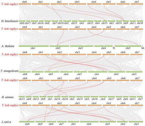 Analysis of collinearity between TkCPT/CPTL and five other species. The gray lines in the background represent collinear modules in the genomes of T. kok-saghyz and other plants. The highlighted red line indicates a collinear CPT/CPTL gene pair. Species names are placed on the left, T. kok-saghyz is indicated in red, and H. brasiliensis, A. thaliana, T. momgolicum, H. annuus and L. sativa. are indicated in black.