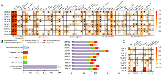 Classification and statistics of cis-acting elements. (A) Fifty-two kinds of cis-acting elements were divided into five categories. The different colors on the heatmap represent the number of different cis-acting elements in each TkCPT gene. (B) Bar chart of the number of cis-acting elements for all genes. (right) The different colors on the stacked graph represent the number of each type of cis-acting element in different TkCPT genes (left). (C) Different colors on the stacked graph represent the percentage of different hormone elements in different TkCPT genes.