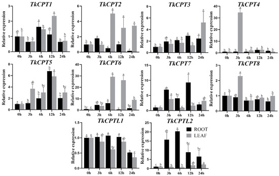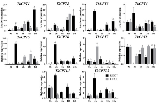 In addition, we treated the roots and leaves of TKS with methyl jasmonate to detect the expression of TkCPT/CPTL genes. In roots, TkCPT6, TkCPT7, and TkCPTL2, were upregulated at higher levels (Figure 8). The expression of TkCPT3 gradually increased with treatment time. Some genes reached the highest expression level at 3 h and 6 h equally, whereas in leaves, some genes reached the highest expression level at 3 h and 6 h. The expression of different members varied by tissue. Only TkCPT8 showed slightly reduced expression levels in roots and leaves and remained at low levels. The results showed that these genes were significantly expressed under methyl jasmonate induction and highly expressed in TKS roots. These experimental results suggested that the TkCPT/CPTL family was involved in the regulation of jasmonic acid metabolism regulatory pathways.
