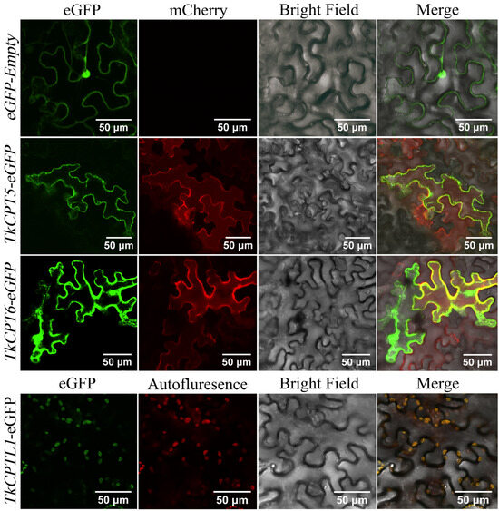 To study the transient expression of TkCPT/CPTLs in the leaves of tobacco, the full-length CDS of TkCPT/CPTLs was PCR-amplified using primers containing KpnI and SalI restriction enzyme (Table S5) and ligated into the KpnI/SalI vector pCAMBIA1300-eGFP to construct the pCAMBIA1300-35s-eGFP, endoplasmic reticulum localization plasmid tagged with pCAMBIA1300-35S-WAK2-mCherry-HDEL (Puint, Shaanxi, China). The constructed vectors were transformed into Agrobacterium tumefaciens GV3101, injected into the bottom of four-week-old tobacco leaves, and incubated in dark culture at 25 °C for 48 h, observed using a laser confocal microscope (Nikon, Tokyo, Japan), with excitation of the GFP. The excitation wavelength of GFP was 488 nm, the excitation wavelength of RFP was 561 nm, and chloroplast auto-fluorescence was 640 nm.