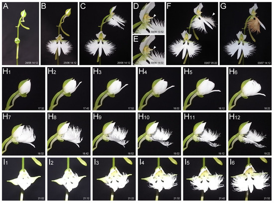 Flowering and withering of Habenaria radiata flowers captured by interval shooting (time-lapse). (A–G) Flowering and withering of flowers. The date (dd/mm) and time of capture are shown. Note that the upper flower, which bloomed later, withered earlier than the lower flower (G), probably due to the loss of pollinium (arrowheads in (D,E)) and subsequent pollination. (H1–H12,I1–I6) Side (H1–H12) and front (I1–I6) views of lip unfolding. The captured time is shown in each panel.