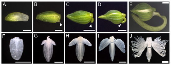 Lip development. (A–E) Floral buds at different stages. Arrowheads in B, C, and D indicate the growing spur. (F–J) Lip inside the floral bud shown in (A–E). The lengths of the floral buds are 1 mm (A,F), 2 mm (B,G), 4 mm (C,H), 6 mm (D,I), and 7 mm (E,J). Scale bars: A, F = 0.5 mm; B, G = 1 mm; C, D, E, H, I, J = 2 mm.