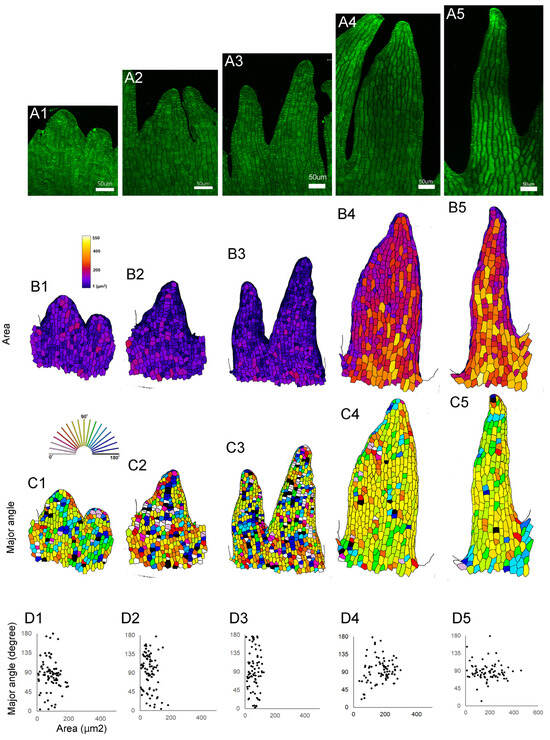 To examine the cellular dynamics during serration development at the lip periphery, lips from different stages were dissected, and the shape of epidermal cells at the serration region was analyzed using fluorescent dye, confocal microscopy, and imaging analysis software (Figure 3A). At early stages, the cell area did not increase; instead, the cell number increased (Figure 3B1–B3). Later, each cell increased in volume (Figure 3B4,B5). The increase in cell volume depends on the directional or polarized cell growth. At early stages, the direction of cell growth was random (Figure 3C1–C3), but later, most cells elongated along the direction of the serration (Figure 3C4,C5). In summary, lip serration begins with the local activation of cell division, followed by cell elongation that increases volume and directs growth, deepening the serration (Figure 3D1–D5).