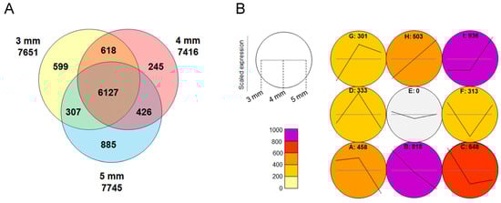 To identify genes involved in floral organ development, particularly those related to the early formation of lip serrations, RNA was extracted from buds measuring 3 mm, 4 mm, and 5 mm in length, as well as from leaves, followed by transcriptome analysis. Approximately 7500 genes were identified as being expressed more than twice as much in the buds compared to the leaves, and 6127 of these genes were commonly expressed in all the buds (Figure 4A). Gene Ontology (GO) analysis of the common genes revealed those related to floral organ formation, mitosis, and meiosis (Table S1). Among them, 152 genes related to floral organ formation, including floral homeotic genes, were identified (Table S2). This analysis comprehensively revealed the transcript sequences expressed in Habenaria radiata flowers.