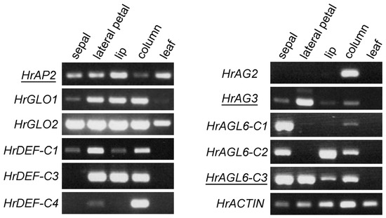 We examined the expression patterns of these genes in floral organs using RT-PCR (Figure 5). HrAP2 was expressed in all floral organs, including the leaves. HrGLO1 and HrGLO2 were expressed in all floral organs, whereas the HrDEF genes showed differential expression. Specifically, HrDEF-C3 was expressed in both the petals and the column, while HrDEF-C4 was strongly expressed in the column. HrAG2 was expressed in the column, whereas HrAG3 was strongly expressed in lateral petals but weakly expressed in other floral organs, suggesting that HrAG3 may have a function distinct from class C in flower development. HrAGL6 genes were expressed in the sepals and the column, and of particular interest, they exhibited different expression patterns in the petals. HrAGL6-C1 was either not expressed or weakly expressed in petals, HrAGL6-C2 was expressed in the lip, and HrAGL6-C3 was more highly expressed in lateral petals than in the lip. These expression patterns support previous reports [14,15,16] and the two orchid models explaining the differentiation of second whorl organs [17,18,19,20,21,22].