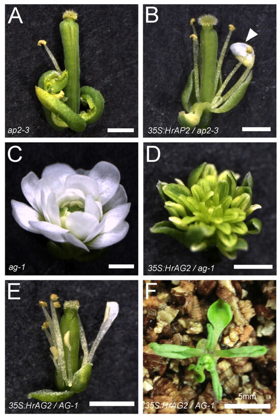 HrAP2, HrAG, and HrAGL6 genes were cloned into the qCR4-TOPO vector (Invitrogen, MA, USA) and subcloned into the pAN19 vector carrying CaMV 35S promoter and NOS terminator. The 35Spro:HrAP2, HrAG2, or HrAG3:NOSter cassette was subcloned into the pBIN30 binary vector and transformed to Agrobacterium tumefaciens (Rhizobium radiobacter) strain GV3101_pMP90. The 35S:HrAP2 and 35S:HrAG2 constructs were then transformed into ap2-3/+ and ag-1/+ heterozygous plants, respectively, with the floral dip method [45]. T1 plants were selected on MS media containing 10 µg/mL glufosinate and genotyped for the Arabidopsis AP2 and AG genes. The HrAP2, HrAG3, and HrAGL6-C3 sequences have been deposited in the GenBank database with accession numbers LC856603, LC856604, and LC856605, respectively.