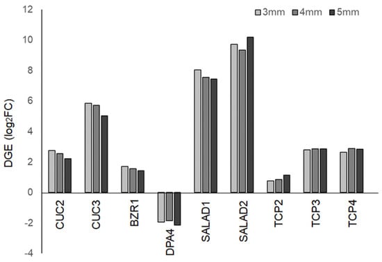 Digital gene expression (DGE) of genes involved in serration formation in floral buds.