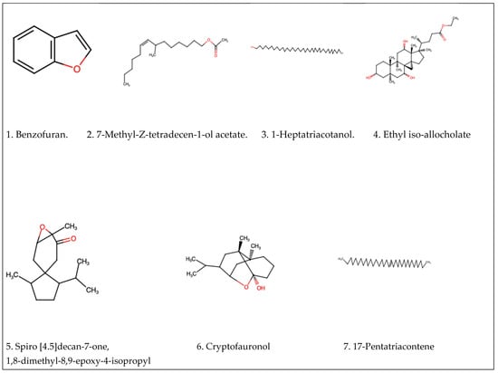 A total of 25 compounds were identified through GC-MS analysis of methanol extract. Table 1 summarises the bioactive compounds, along with their retention time (RT), molecular formula and molecular weight (MW). The GC-MS analysis of the methanol extract of Ziziphus mucronata leaves revealed the presence of several bioactive compounds: Benzofuran, 7-Methyl-Z-tetradecen-1-ol acetate, 1-Heptatriacotanol, Ethyl iso-allocholate, Spiro[4.5]decan-7-one, 1,8-dimethyl-8,9-epoxy-4-isopropyl, Cryptofauronol, 17-Pentatriacontene, N-(thiazol-2-yl)cinnamamide, Ethyl spiro[2.3]hexane-1-carboxylate, 5-Hydroxymethylfurfural, 2-Methyl-9-β-d-ribofuranosylhypoxanthine, 3-Deoxy-d-mannoic lactone, Acetic acid, 2, propyltetrahydropyran-3-yl ester, 4-Methyloctanoic acid, 2-Vinyl-9-[β-d-ribofuranosyl]hypoxanthine, 2-Pentadecanone, 6,10,14-trimethyl, Hexadecanoic acid, methyl ester, Hexanoic acid, pentadecyl ester, E,E,Z-1,3,12-Nonadecatriene-5,14-diol, 2H-Pyran-2-one, tetrahydro-6-undecyl, 2-(3-Hydroxy-2-pentylcyclopentyl)acetohydrazide, α-Tocospiro A, Viridiflorol, Cycloionone, 6,9,12,15-Docosatetraenoic acid, methyl ester. The molecular structure for some of the detected molecules are presented in the figure below, Figure 1.