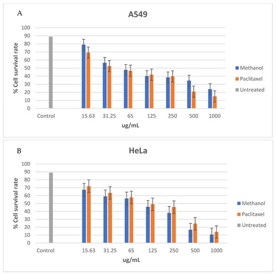 Cell survival rate after 48 h of (A) A549 cells treated with methanol leaf extract against paclitaxel and (B) HeLa cells treated with methanol extract against paclitaxel; cell survival rate after exposure to methanol extract and paclitaxel for 48 hrs and untreated cells represented as control.