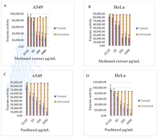 Kinase activity was determined by measuring ATP consumption in relation to ADP using the Universal Glo assay in cell lysates under different treatment conditions after 48 h of exposure: (A) A549 cells treated with methanol extract compared to untreated lysates, (B) HeLa cells treated with methanol extract compared to untreated lysates, (C) A549 cells treated with paclitaxel compared to untreated lysates, and (D) HeLa cells treated with paclitaxel compared to untreated lysates.
