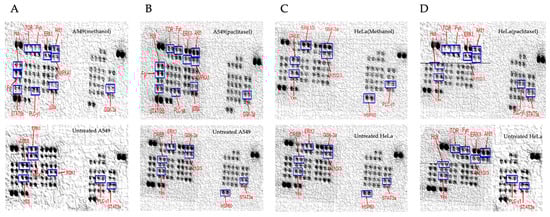 The study investigated the kinase inhibitory profile of Ziziphus mucronata methanol extract on A549 and HeLa cells. The cell lysates were analysed for the phosphorylation levels of intracellular kinases using an antibody array (reference). The activation states of the protein kinases, as shown in Figure 4, were assessed. Lysates from A549 cells treated and untreated with the methanol extract and paclitaxel are labelled (A) and (B), respectively, while lysates from HeLa cells treated and untreated with the methanol extract and paclitaxel are labelled (C) and (D), respectively.