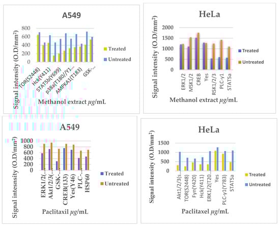 The results in Figure 4 showed that the methanol extract downregulated the activity of eight kinases in A549 cells treated with methanol extract, including TOR, Fyn, HcK, Fgr, STAT5b, PLC-y1, p38α, ERK1/2, AMPKA, Akt1/2, and GSK-3α/β. In contrast, five different kinases, MSK1/2, CREB, RSK1/2/3, PLC-Y-1, and STAT5a were downregulated in HeLa cells following treatment with the methanol extract. A549 and HeLa cell lines showed different kinase downregulation profiles in response to paclitaxel treatment. Paclitaxel specifically caused the downregulation of a number of kinases in A549 cells, including ERK1/2, Akt1/2, GSK-3α/β, CREB, YES, PLC-γ1, and HSP60. On the other hand, six kinases: Akt1/2/3, TOR, Fyn, Hck, ERK1/2, YES, PLC-γ, and STAT5a were downregulated in HeLa cells. Remarkably, kinase deregulation was also brought about by the methanol extract treatment: ERK1/2 and PLC-γ1 were downregulated in both A549 and HeLa cells. Notably, ERK1/2, Akt1/2/3, and YES were all deregulated in both cell lines after paclitaxel treatment as can be seen on Figure 5 below. Additionally, the kinase profile of HeLa cells treated with paclitaxel and A549 cells treated with the methanol extract showed downregulation of the kinases Akt1/2/3, TOR, Fyn, and Hck.