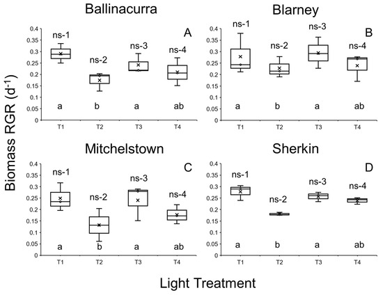(A–D) Median relative growth rate for four Lemna minor clones grown following exposure to the four different light treatments (T1, T2, T3, and T4; see Table 1) when cultivated on half-strength Hutner’s medium. Interquartile ranges (IQR) and maximum and minimum IQR values are also shown, while × denotes mean values. Clones were collected from different locations throughout southwest Ireland. See Table 1 for description of light treatments. Shared letters indicate statistical similarity among pairwise comparisons within each clone (a or b; p > 0.05). Statistical differences were not detected among clones within each light treatment (i.e., no significant difference: ns-1, -2, -3, -4; all p > 0.05).