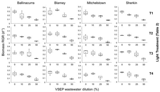 The RGR of selected L. minor clones grown in various dilutions of VSEP ADLF-pig slurry under different light treatments significantly differed (LM: χ2 = 272.8, df = 9; p < 0.0001; Figure 3). Greater dilution tended to increase RGR (p < 0.0001; Figure 3), with different RGRs detected among selected L. minor clones (p < 0.0001), while light regimes also impacted RGR (p < 0.0001). No interactive effects were detected (all p > 0.05). Overall, when taken as a whole, the RGR of “Blarney” was greater than “Ballinacurra”, “Mitchelstown”, or “Sherkin” (all p < 0.001). In turn, duckweed RGR was greater for samples cultivated on a 10% dilution of VSEP ADLF-pig slurry in comparison to duckweed grown on ≥ 25% dilutions (all p < 0.0001) but did not differ from control samples (all p > 0.05). All light treatments differently impacted RGR (T1:T2, T1:T4, T2:T3, T3:T4 all p < 0.001; T2:T4 p < 0.05), other than T1:T3 (p > 0.05; Figure 3). Trends depicted by pooled data are further supported by a complete matrix of individual pairwise comparisons generated through post-hoc analysis (n = 2016; see Supplementary Material).