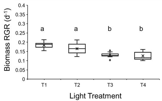 Median relative growth rate for Lemna minor “Blarney” clone cultivated within a multitiered duckweed cultivation system under the four different light treatments (T1, T2, T3, and T4; see Table 1). Duckweed was cultivated on a commercial-grade nutrient-rich growth medium. Interquartile ranges (IQR), maximum and minimum IQR values, and outliers (○) are also shown, while × denotes mean values. Shared letters indicate statistical similarity among pairwise comparisons (a or b; p > 0.05).