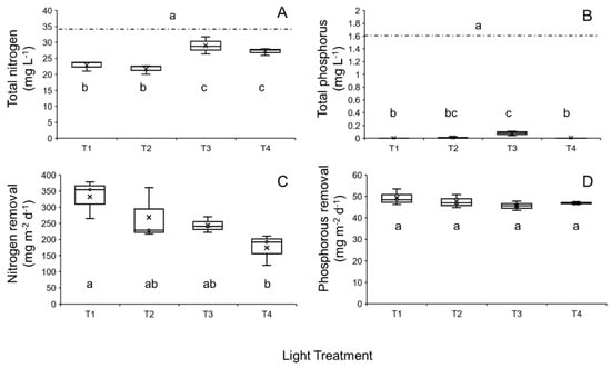 Median total nitrogen (TN: (A)) and total phosphorous (TP: (B)) content of the commercial-grade growth medium following a 7-day cultivation period for Lemna minor “Blarney” clone within a multitiered duckweed cultivation system under the four different light treatments (T1, T2, T3, and T4; see Table 1). The dashed lines indicate the initial concentration of TN and TP (i.e., Day 0). Calculated median update values (mg m−2 d−1) are shown for TN and TP at each light treatment (C,D). Interquartile ranges (IQR), maximum and minimum IQR values, and outliers (○) are also shown, while × denotes mean values. Shared letters indicate statistical similarity among pairwise comparisons for each panel (a, b or c; p > 0.05).