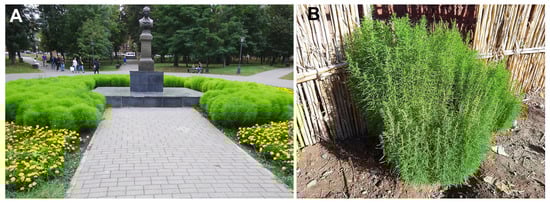 Recently, Kochia (type species: K. arenaria (Maerkl.) Roth = K. laniflora (S.G.Gmel.) Borbás) was reduced to a synonym of Bassia All. based on its molecular phylogeny []. A major part of the Kochia species was transferred to Bassia, or their position was confirmed in the latter genus from the morphological point of view (e.g., [,,,]). The Bassia scoparia clade, the topic of our study, appeared in this phylogeny as a separate group, corresponding to the traditional B. sect. Semibassia G.Beck [] (p. 155).