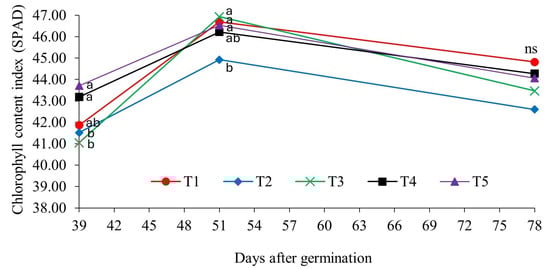 Chlorophyll content index in response to bioinputs (T1—Control; T2—A. brasilense strains Ab-V5 and Ab-V6; T3—P. fluorescens strain CNPSo 2719 and A. brasilense strains CNPSo 2083 and CNPSo 2084; T4—P. aryabhattai, B. haynesii, and B. circulans; and T5—P. megaterium strain BRM 119 and B. subtilis strain BRM 2084), in growing season 2023/2024. Planaltina/DF. Means followed by the same letter in a row do not differ at 5% probability by Duncan’s test.