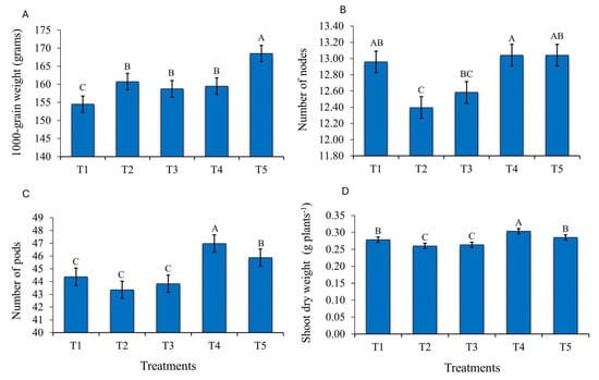 Soybean performance in response to bioinputs. 1000-grain weight (A), number of nods (B), number of pods (C), and shoot dry weight (D) in response to different bioinputs (T1—Control; T2—A. brasilense strains Ab-V5 and Ab-V6; T3—P. fluorescens strain CNPSo 2719 and A. brasilense strains CNPSo 2083 and CNPSo 2084; T4—P. aryabhattai, B. haynesii, and B. circulans; and T5—P. megaterium strain BRM 119 and B. subtilis strain BRM 2084), in growing season 2023/2024. Planaltina/DF. Means followed by the same letter do not differ at 5% probability by Duncan’s test.