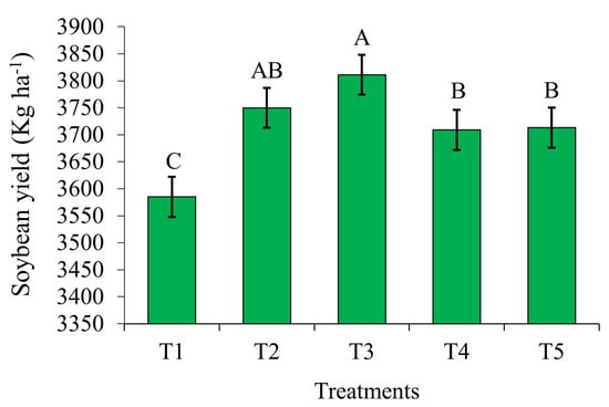 Soybean yield (kg ha−1), in response to different bioinputs (T1—Control; T2—A. brasilense strains Ab-V5 and Ab-V6; T3—P. fluorescens strain CNPSo 2719 and A. brasilense strains CNPSo 2083 and CNPSo 2084; T4—P. aryabhattai, B. haynesii, and B. circulans; and T5—P. megaterium strain BRM 119 and B. subtilis strain BRM 2084), in growing season 2023/2024. Planaltina/DF. Means followed by the same letter do not differ at 5% probability by Duncan’s test.