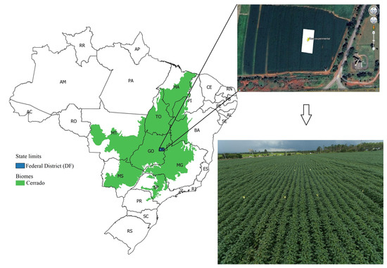 This study was carried out in the experimental area of Embrapa Cerrados, in Planaltina, Distrito Federal (15°36′38.82″ S, 47°42′13.63″ W; 980 m asl.). Soybean was planted on 1 December 2023 and harvested on 22 March 2024 (Figure 4).