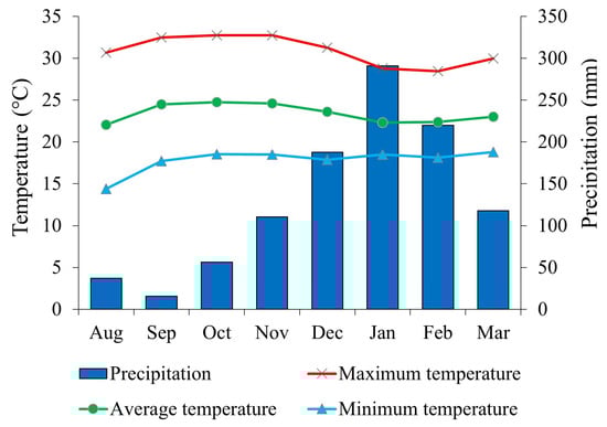 Rainfall, maximum temperature, and mean and minimum temperature during the experimental period of the 2023/2024 growing season.