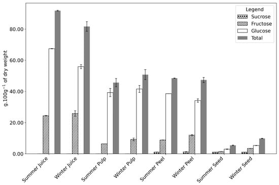 Sugar content is highest in the juice, as the juicing process removes the fibrous components, increasing the sugar amount. Andreu Nuncio-Jáuregui [] reported that the peel constantly shows less sugar overall (in both glucose and fructose) than the pulp, as also indicated by our results. In all samples, a significantly higher amount of sugars (remaining carbohydrates) was registered in the winter samples. Figure 3, Table A1, and the chromatogram in Figure A1 show an accumulation of fructose in the winter compared to the summer sample. This carbohydrate is the main reason for the higher sugar content in winter. The role of fructose in a plant is not only as a source of energy but also as a regulatory metabolite.