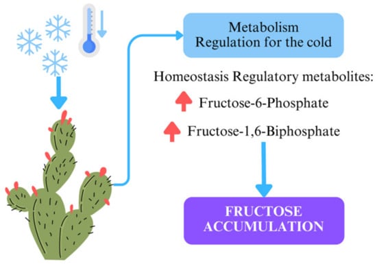 These processes explain the significant accumulation of fructose observed in the winter samples. This metabolic shift not only highlights the plant’s adaptation to cold stress but also positions Opuntia as an excellent candidate for natural sweeteners or energy-boosting products. Moreover, its high fiber content supports its classification as a functional food, promoting gut health. A diagram of this mechanism is presented in Figure 4. Further research into enzymatic activities and gene expression regulating these metabolic shifts could provide deeper insights into Opuntia’s adaptive strategies.